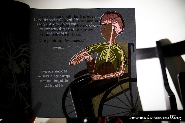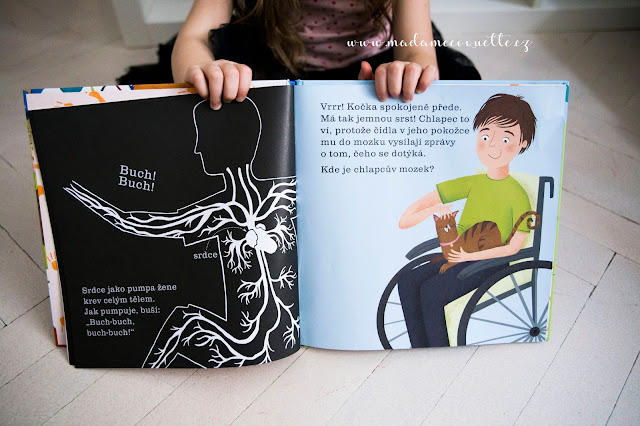 Kniha Lidské tělo mě velmi mile překvapila ještě v jedné věci. Kromě toho, že prosvěcování je skvěle názornou formou vysvětlení základů anatomie, v ní totiž taky najdete třeba kluka na vozíčku - ovšem bez toho, aby se text jeho vozíku jakkoli týkal. Možná se vám to zdá jako drobnost, ale ve skutečnosti je to docela velká věc, která pomáhá dětem brát lidi s postižením normálně a napomáhá tak integraci postižených dětí. Možná by mě to dřív vůbec nenapadlo, protože člověk je oblblý tím "ideálním světem", který kolem nás vytváří nejrůznější reklamy a média, ale už docela dlouho sleduji projekt Changing the face of beauty, který se zasazuje o integraci lidí s postižením do světa modelingu a reklamy a tím velké změny pohledu na krásu, takže mě tenhle obrázek hned trknul a v dětské knize opravdu nesmírně potěšil. Takové obrázky by se ale měly v dětské literatuře objevovat daleko častěji.