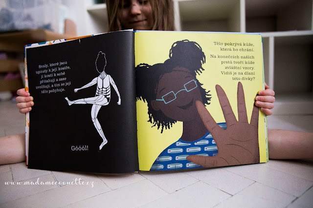 Kromě kluka na vozíku tu taky najdete lidi různých barev pleti a třeba taky holky, co hrají fotbal. Kniha prostě kromě vzdělávání v anatomii lidského těla cíleně boří různé stereotypy.